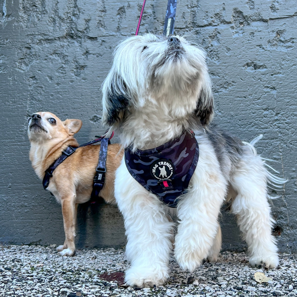 Camo Dog Harness - Camo Chic - Chihuahua and mix breed dogs wearing black and gray camo adjustable dog harnesses with hot pink accents standing in front of a gray concrete wall - Wag Trendz