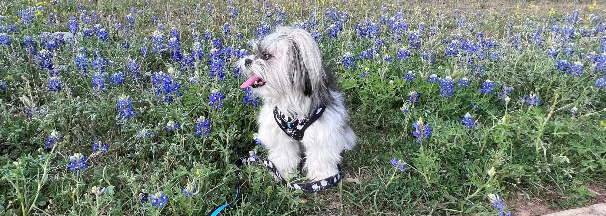 Teal Dog Harness - Splatter Swagger - Shih Tzu dog wearing black and white splatter adjustable dog harness vest with teal accents sitting outdoors in a field of Blue Bonnets - Wag Trendz