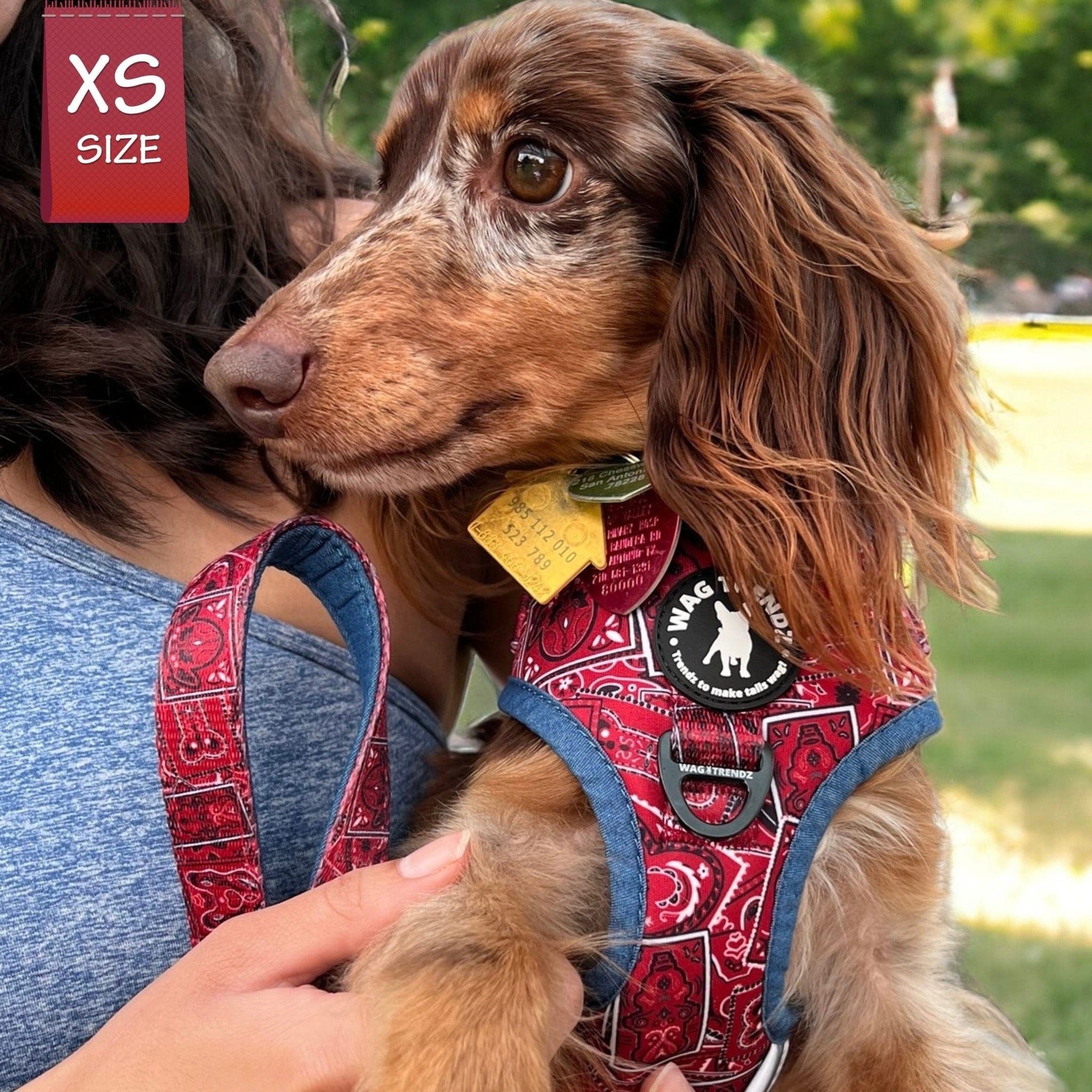 This trendy accessory boasts a exclusive-designed dog-inspired red bandana print that combines classic paisley style with dog theme print and denim accents, creating a fusion of street fashion and canine-inspired design.