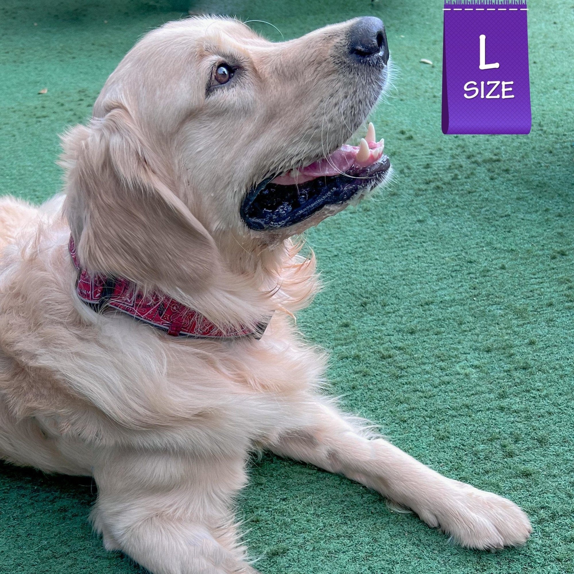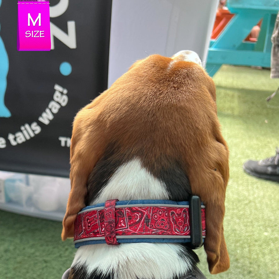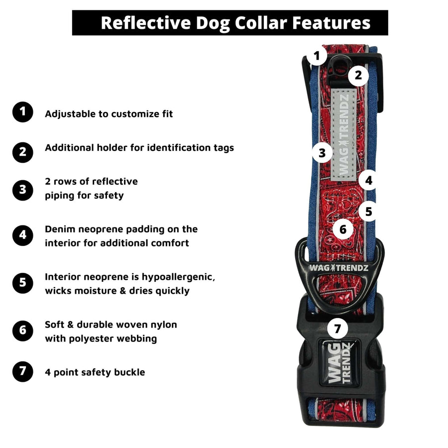 The collar boasts a stylish canine-inspired paisley print, and it has double reflective strips for visibility in low-light conditions. It's also padded with Denim neoprene for added comfort and designed with an extra-wide shape to distribute pressure evenly around your dog's neck. The collar is fully adjustable to fit dogs of all sizes, and it features an upgraded triangle D-ring for attaching the leash.