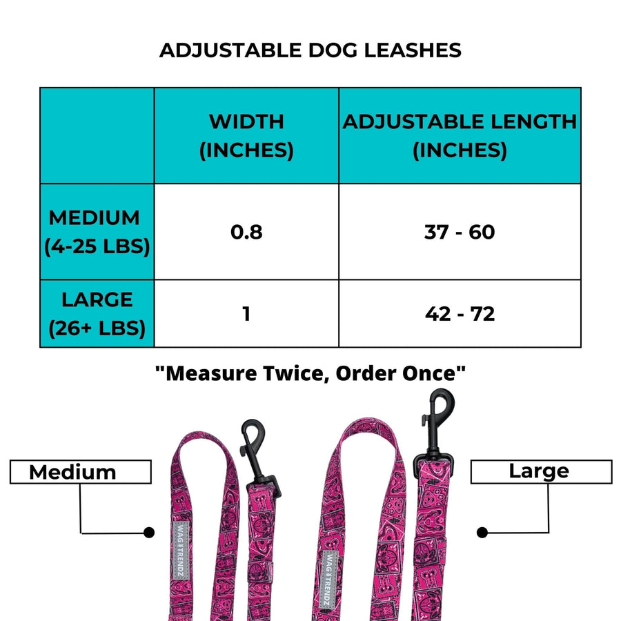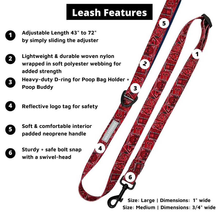 What makes this set even more special is the exclusive dog-inspired bandana print from the Bandana Boujee Collection, which adds a touch of urban street style to your dog's look. The matching adjustable dog leash is made of durable woven nylon and features a reflective tag and heavy-duty clip for maximum safety. It even includes an extra D-ring for holding a poo bag holder and a poop buddy for used poop bags.
