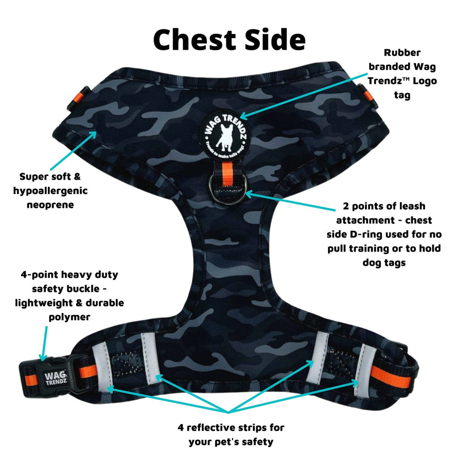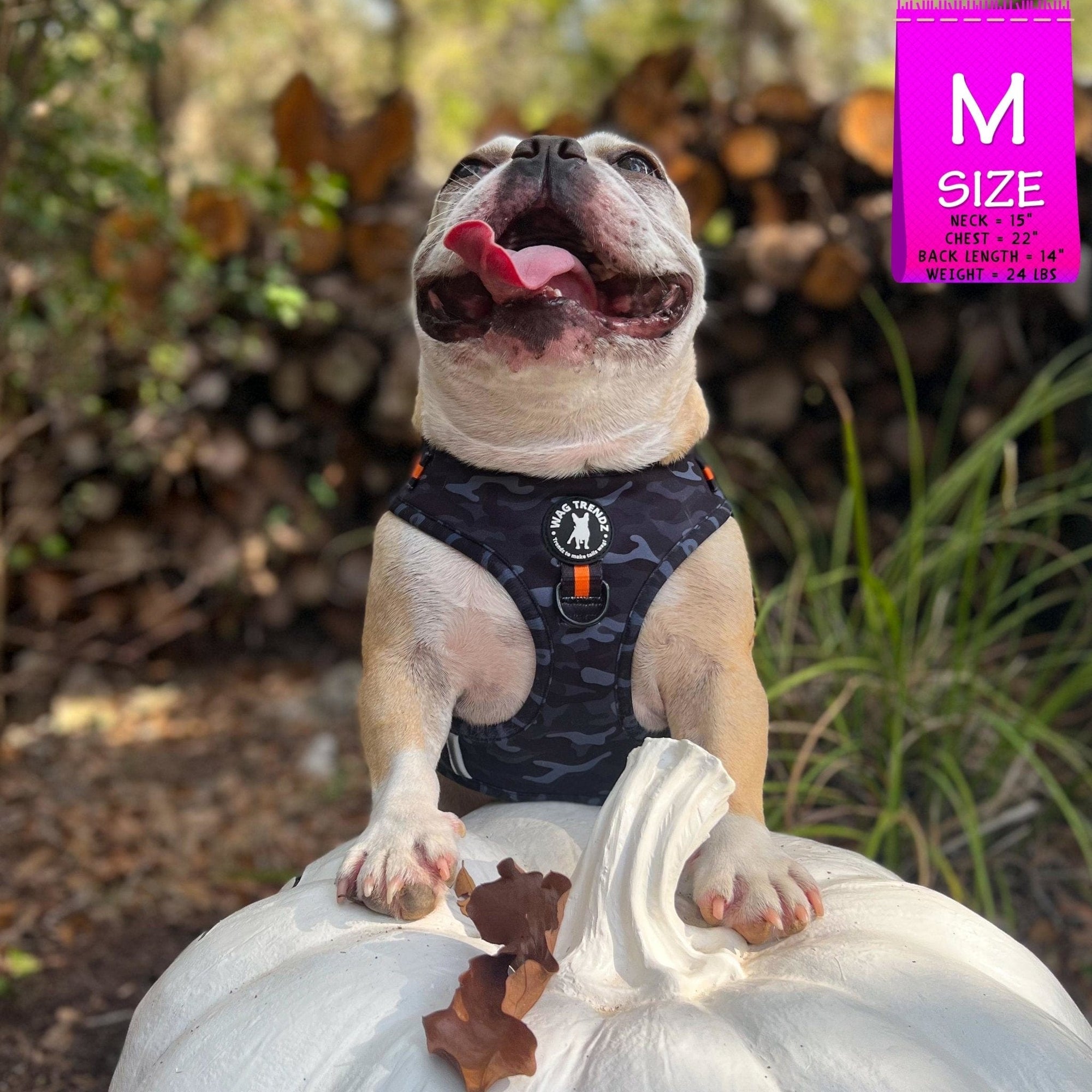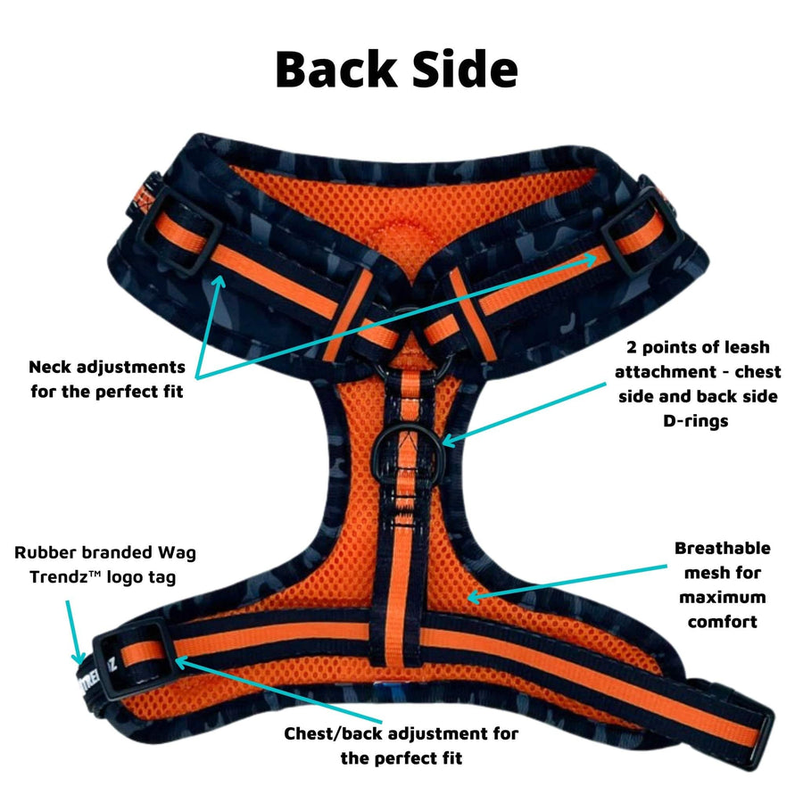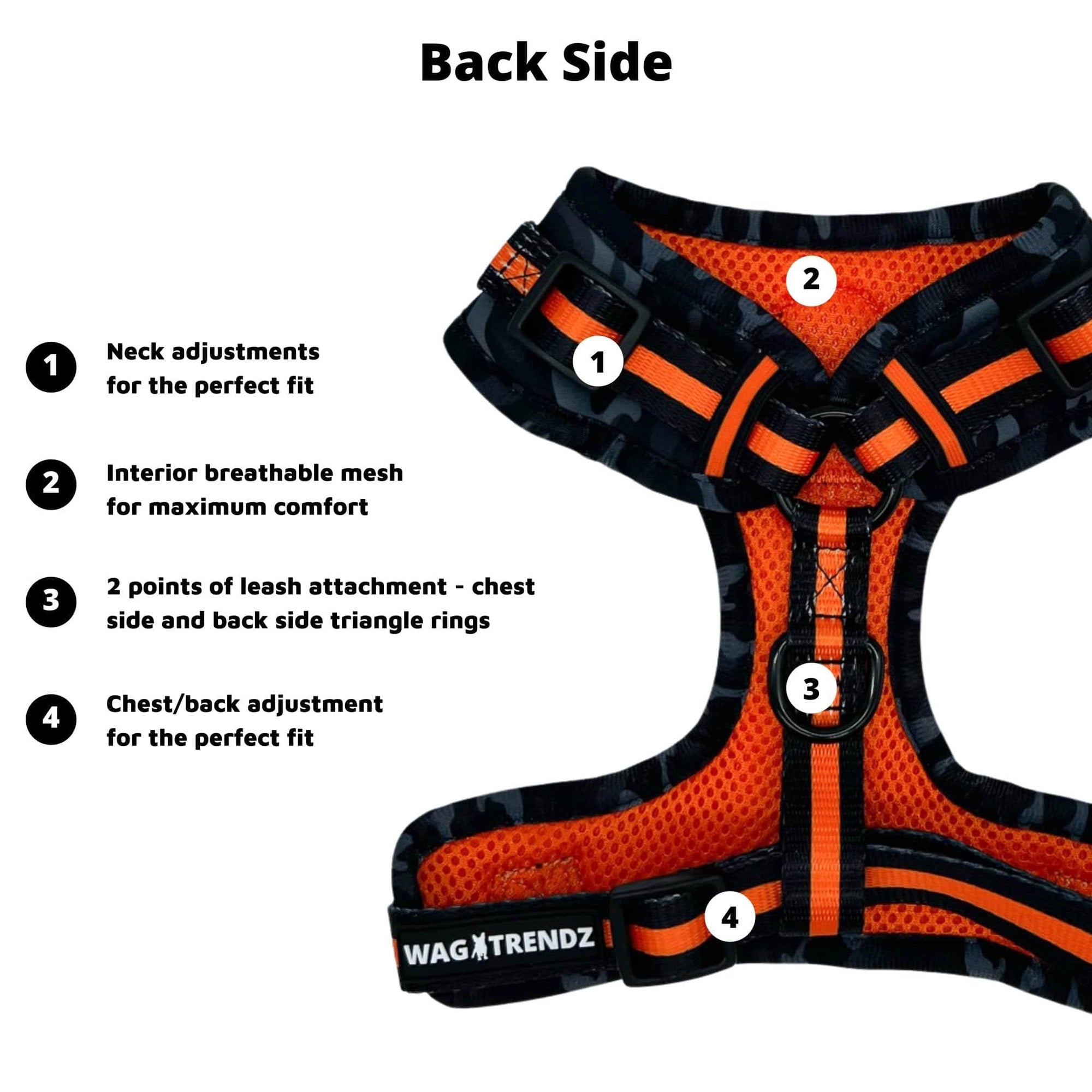 Inspired by street-fashion trends, this black and gray Camo No Pull Dog Harness with orange accents is both relatable and edgy.