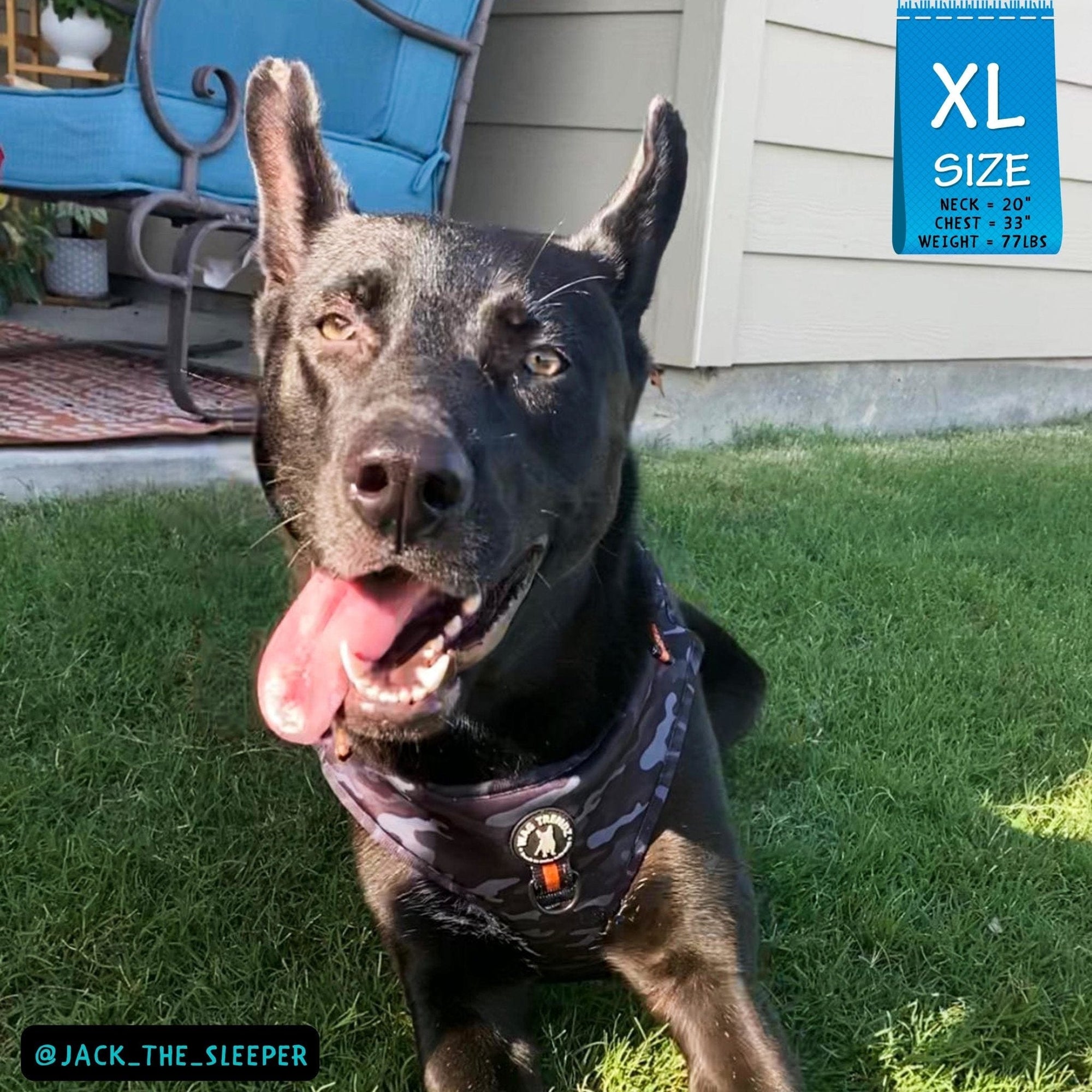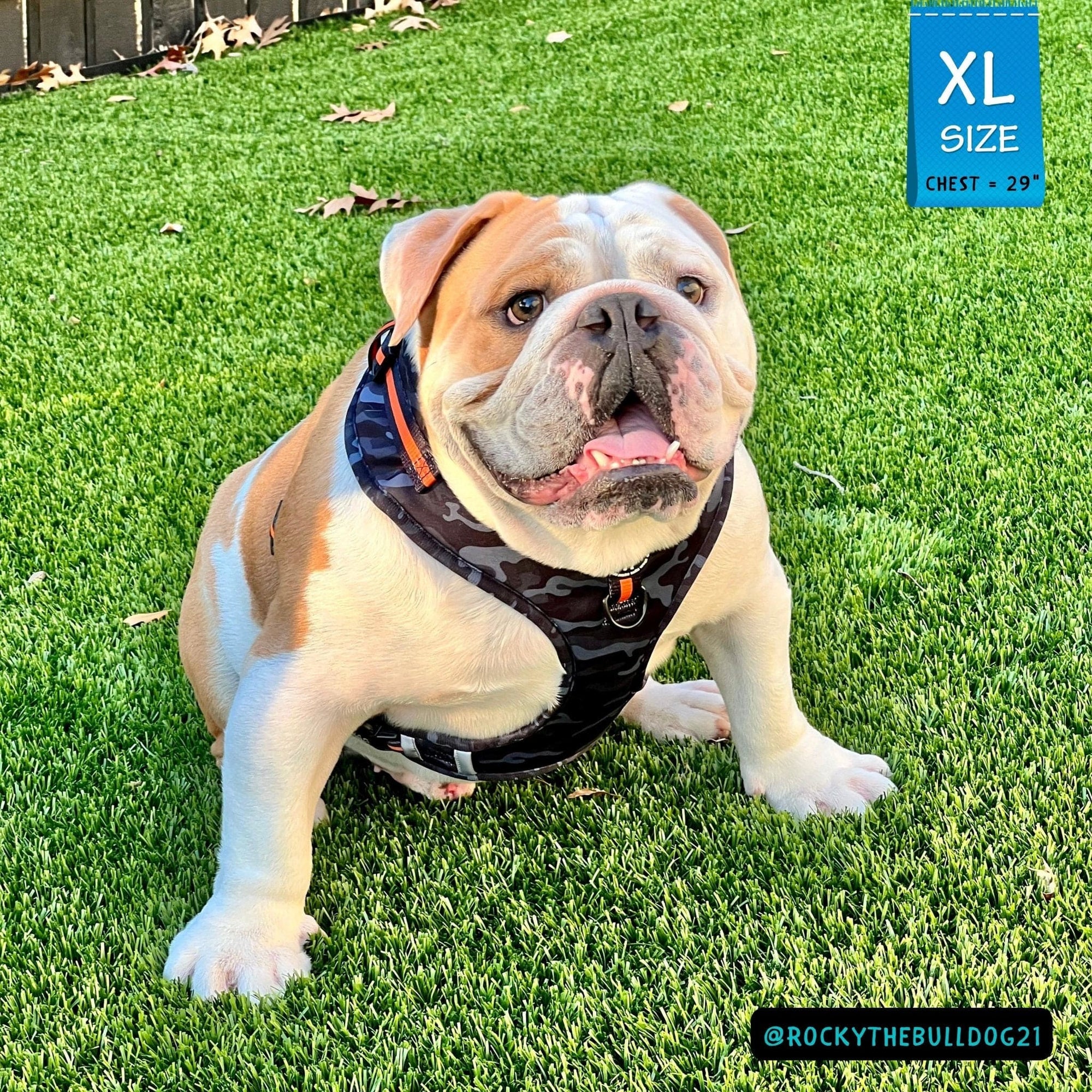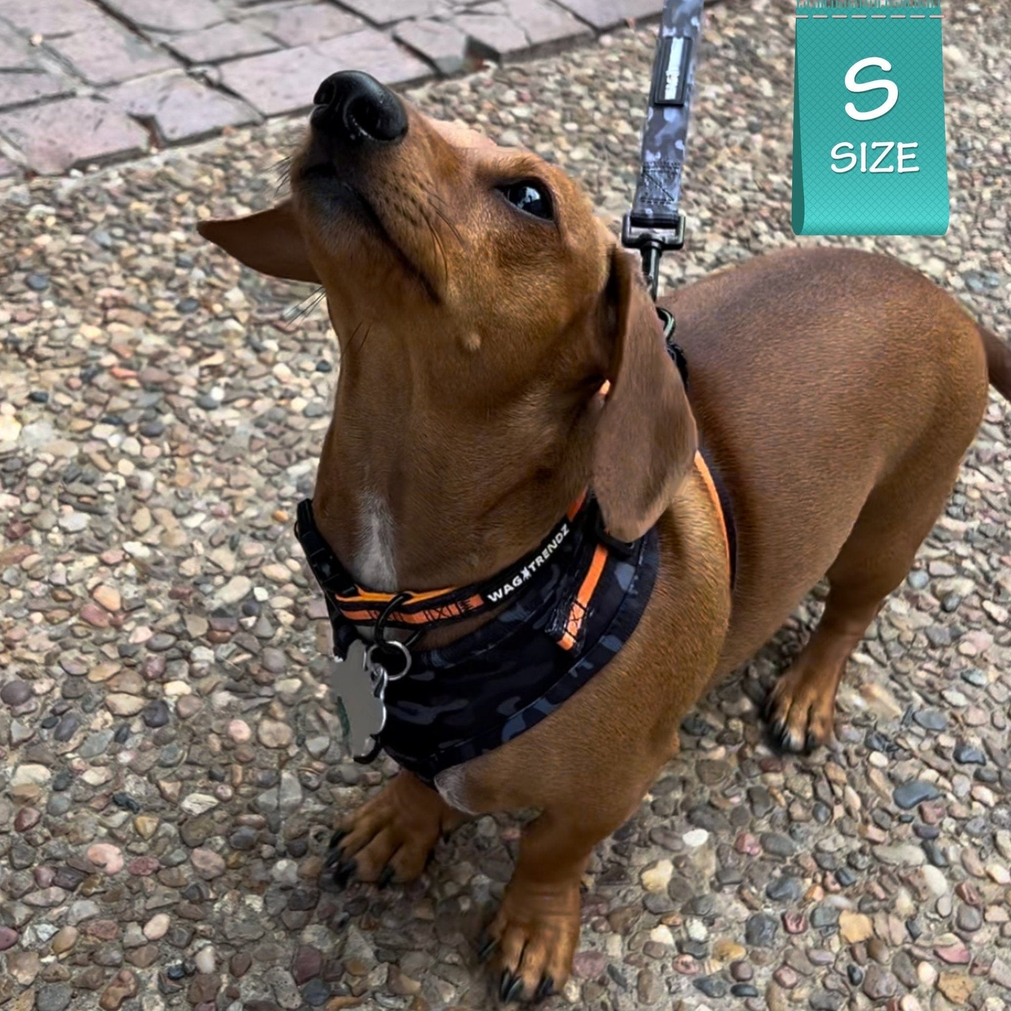 Inspired by street-fashion trends, this black and gray Camo No Pull Dog Harness with orange accents is both relatable and edgy.