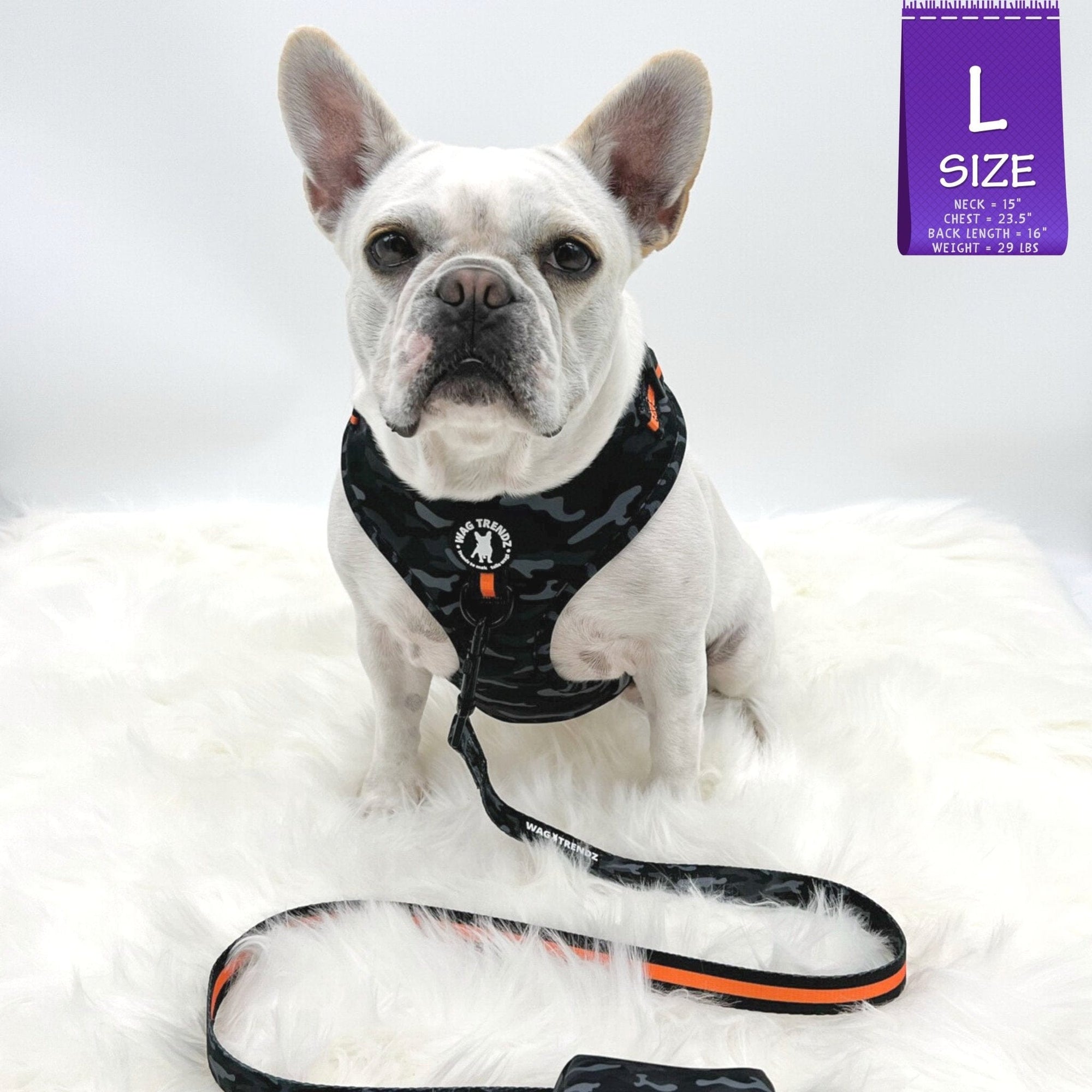 Who says camo can't be chic? Embrace the trendy black & gray camo design to stand out from the crowd. Wag Trendz Camo Chic (SHēk) Collection draws inspiration from street-fashion trends, creating a relatable yet edgy pattern for your beloved dog. To add a touch of vibrancy, the design includes a pop of neon orange in the design, making your furry friend the envy of the dog park in no time!