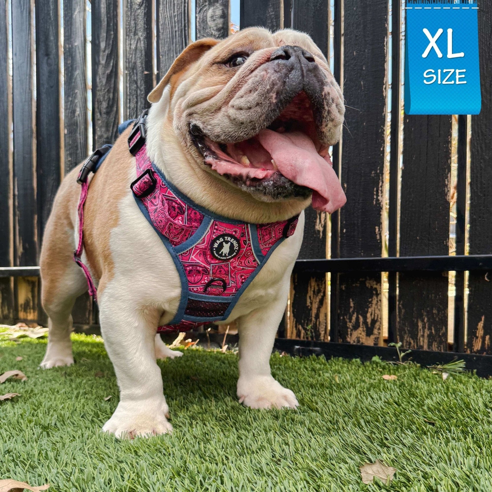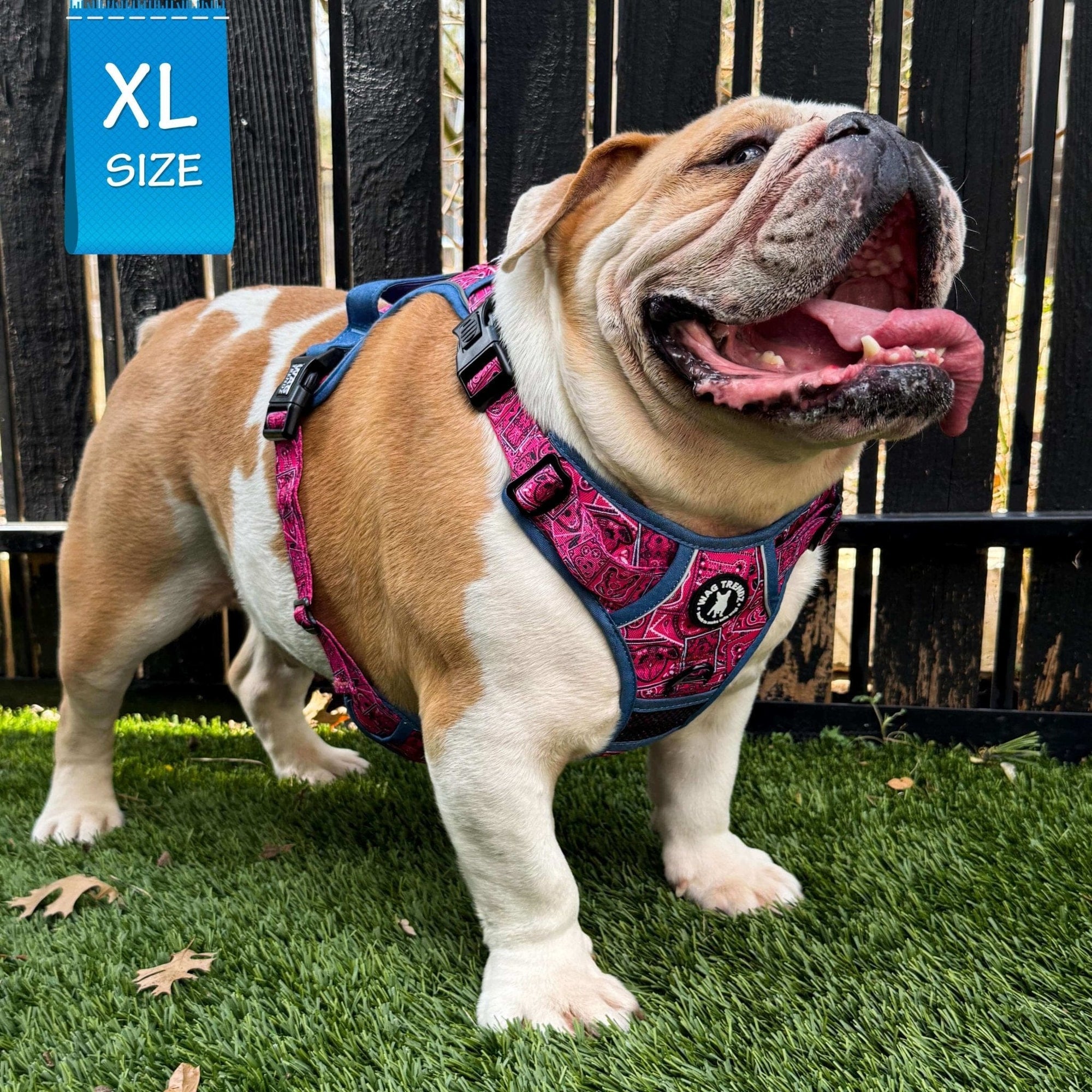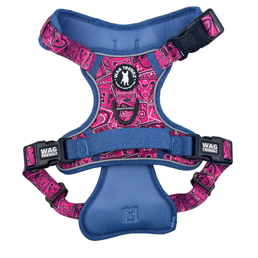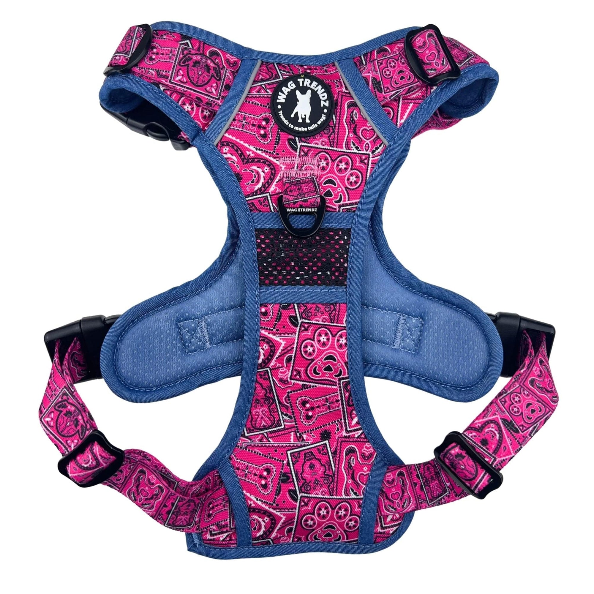 The Hot Pink Bandana Boujee No Pull Dog Harness with Denim Accents is the perfect blend of street style and classic paisley bandana design, with a canine-inspired twist.