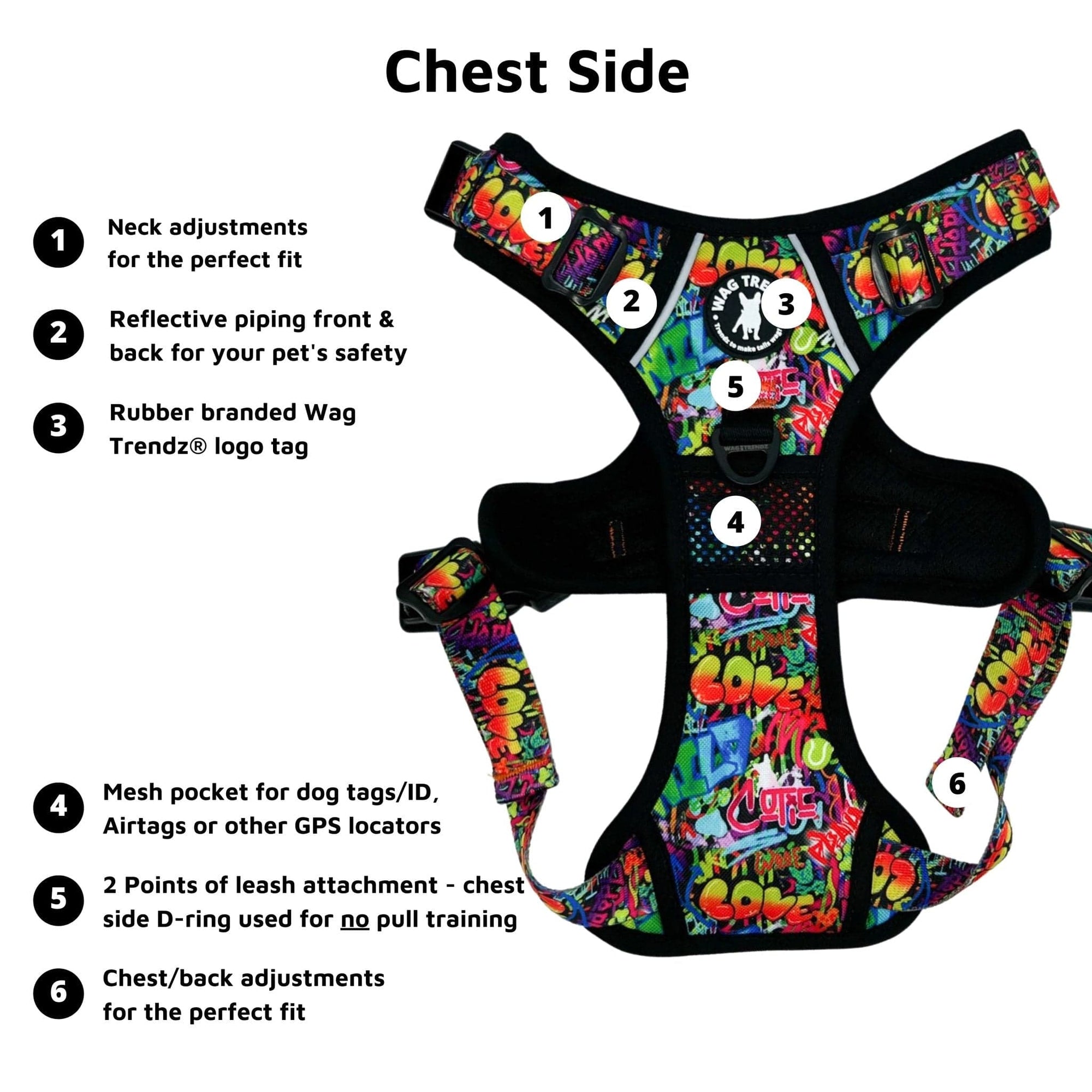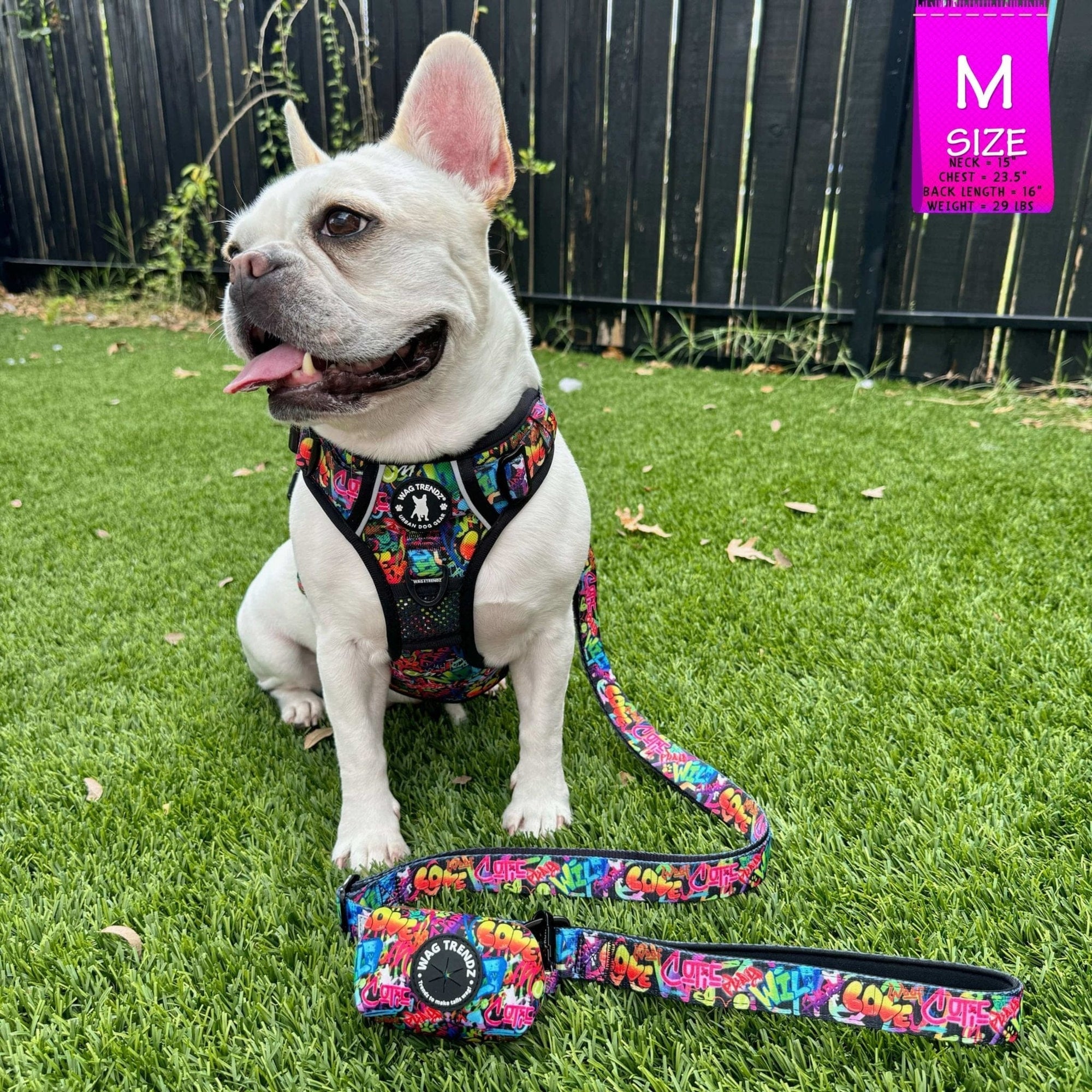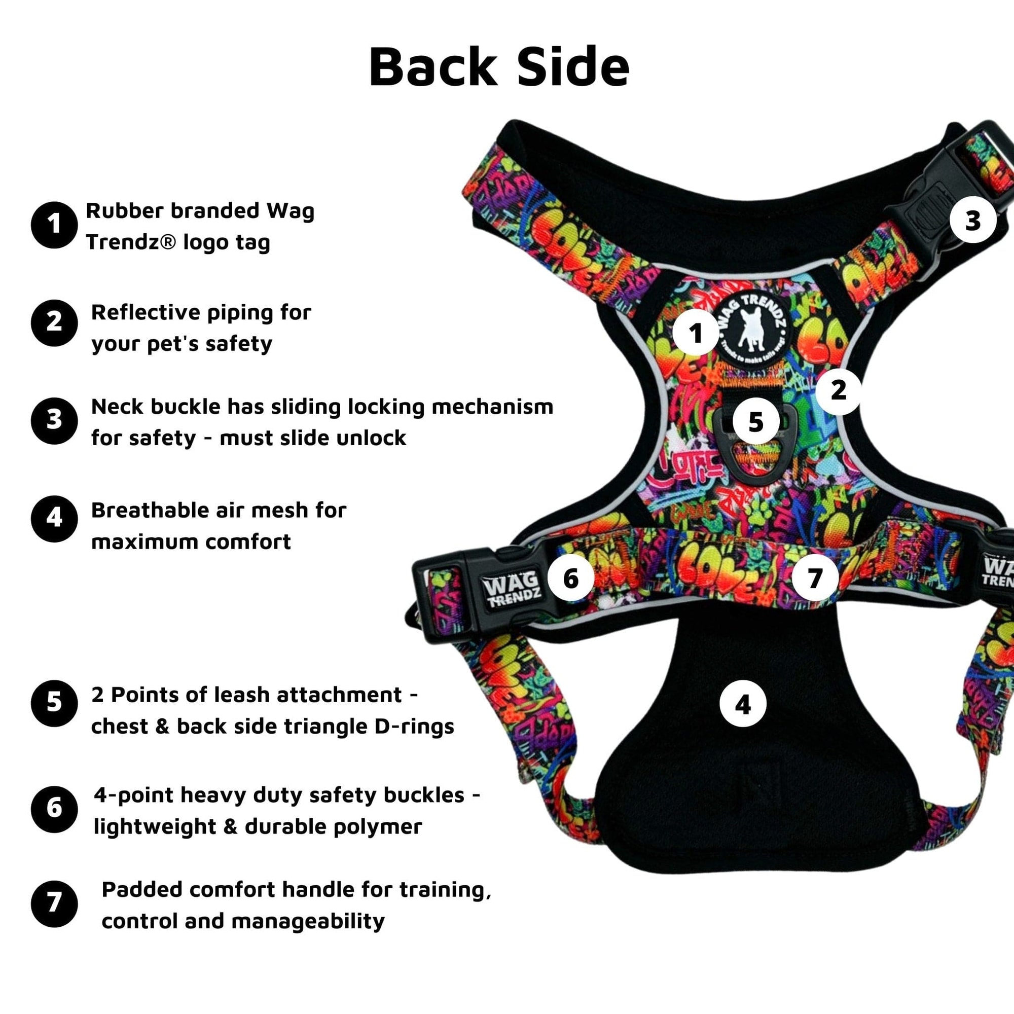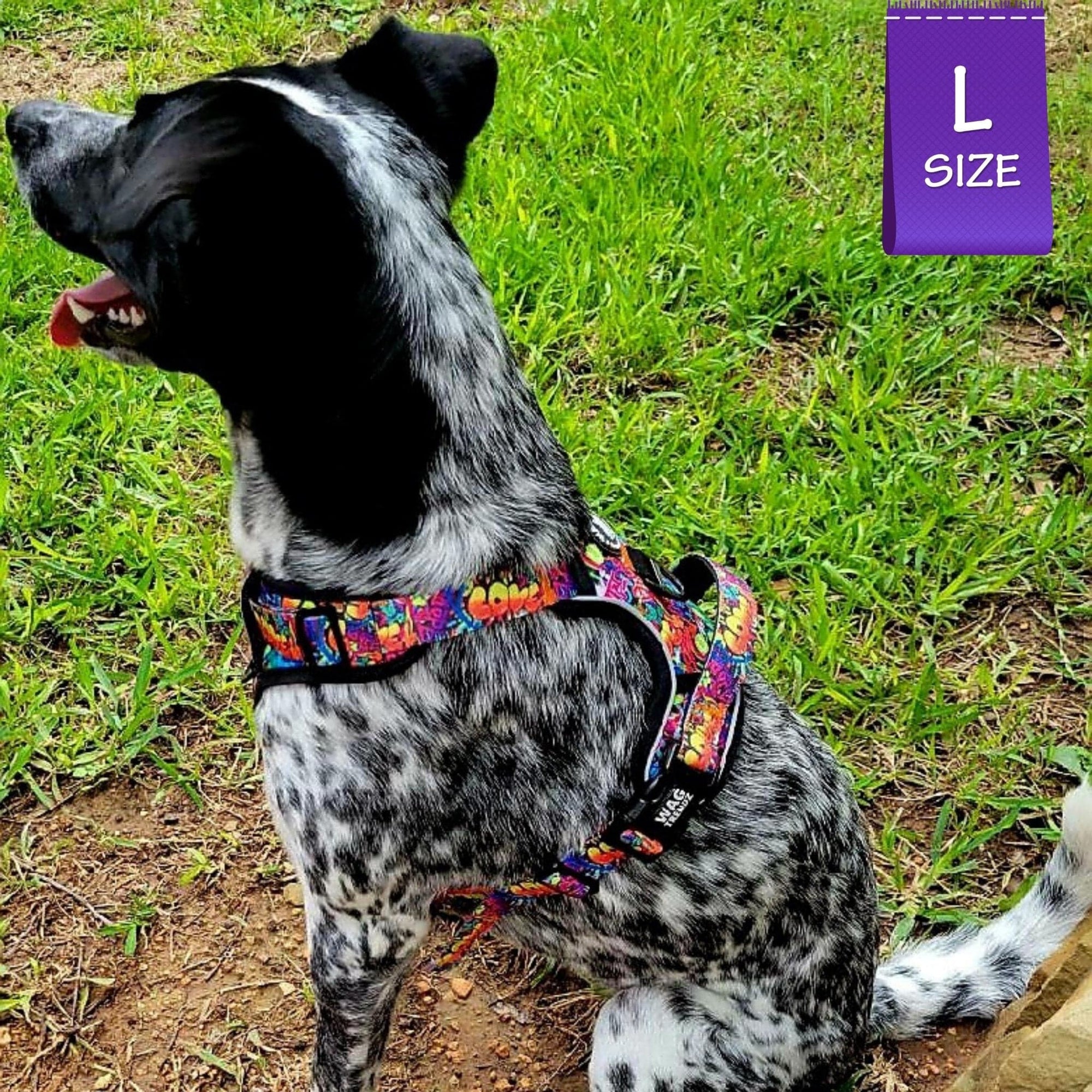 Putting on and taking off the harness is a breeze, thanks to its chest and neck buckles, making it especially ideal for dogs that dislike things going over their heads. The Streetstyle Graffiti edition takes your dog's urban streetstyle to a whole new level, combining fashion with safety and comfort. The exclusive dog graffiti design in the Street Graffiti Collection is inspired by the love for dogs.