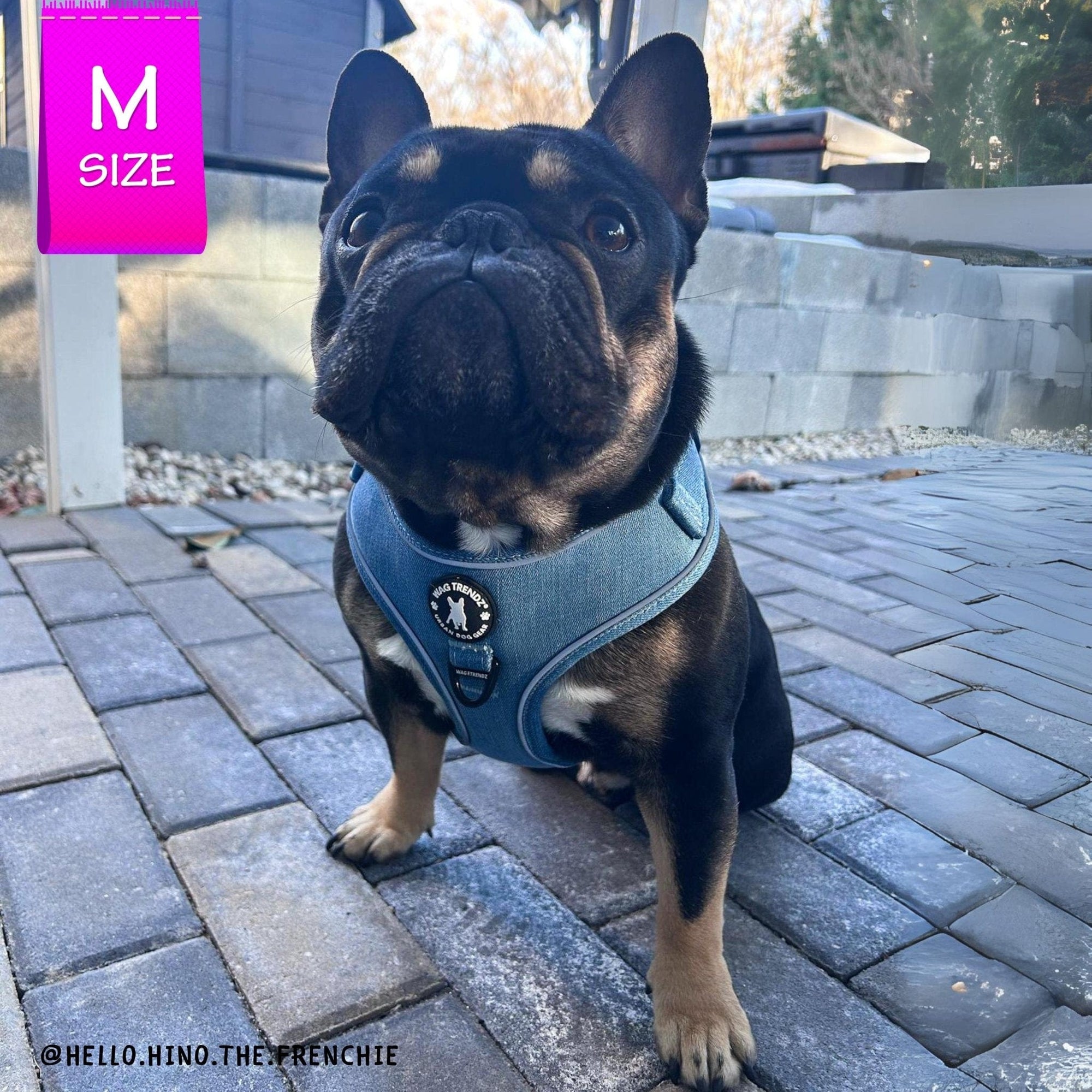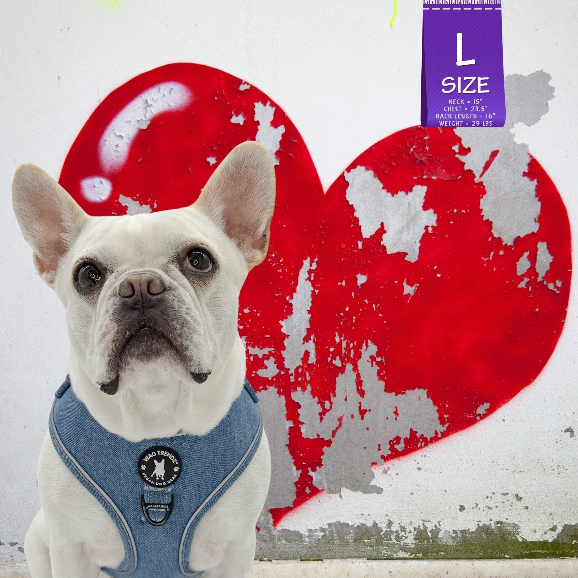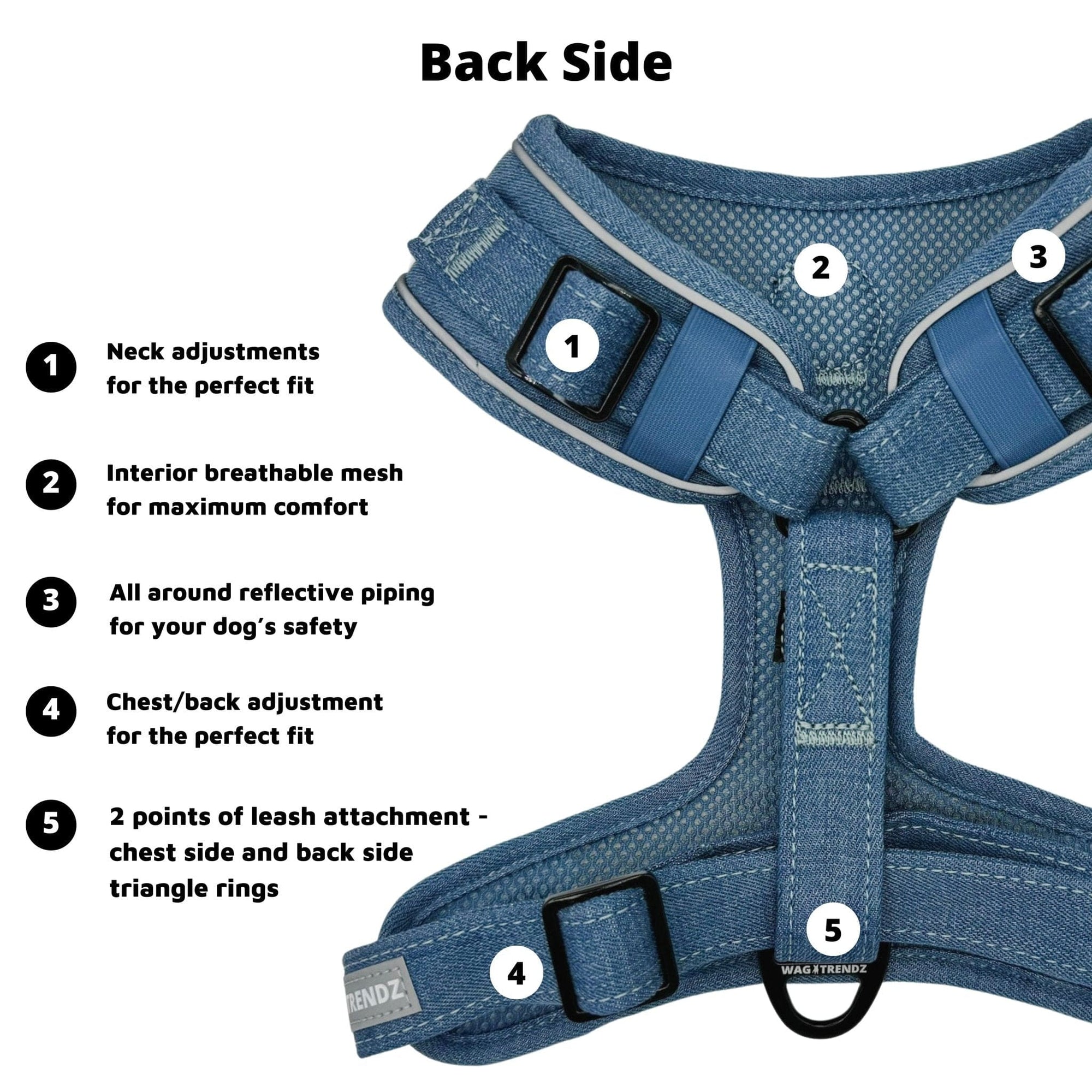 The harness's interior is designed with your dog's comfort in mind, featuring a soft, breathable mesh padding ideal for daily wear. The matching leash, made from durable yet soft denim, includes a reflective tag and a robust clip for added security, along with a heavy-duty D-ring for the included poop bag holder, ensuring convenience and readiness during your strolls.