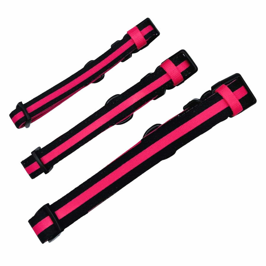Looking for a collar that combines style and function? Look no further than the nylon dog collar in solid black with a bold hot pink stripe.