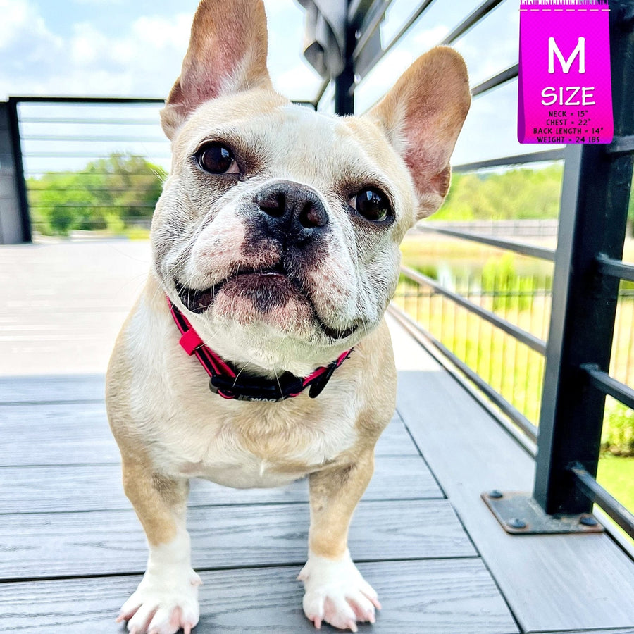 For the most accurate size for your pet, measure the chest just behind the front legs which should be the widest part of your dog's mid-section with a cloth tape measure. Measure your pet's neck at the base (where a collar would sit). You want the cloth tape to be snug but not tight for both the chest and the neck. If you don't have a cloth tape measure, a piece of string, yarn, or thin rope will work and then measure with a rigid ruler afterwards. A good rule of thumb, is measure with enough room for two fingers widths between your pet's chest and the measuring device for maximum comfort.